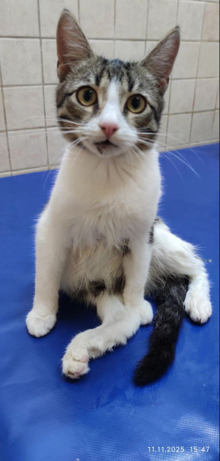 11.11.2025 - This 5-month old kitten was found with a displaced fracture of femur and tibia. Requires a surgery with metal plate installation for bones to merge and heal.